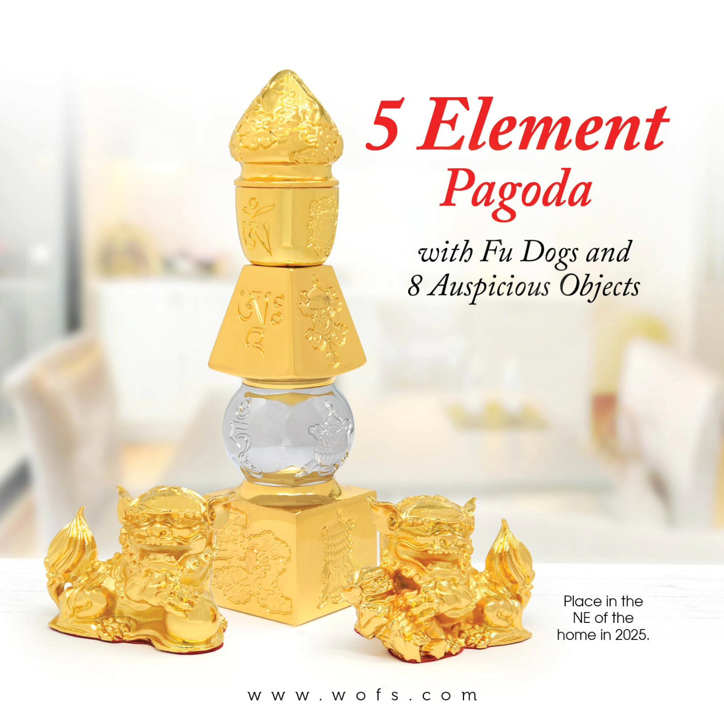 金属製の五行塔には、呪文「オン・アー・ホム」と8種の幸運シンボル「八吉祥」が描かれているので、不運を幸運に転換し、その幸運を8方位に広げます。